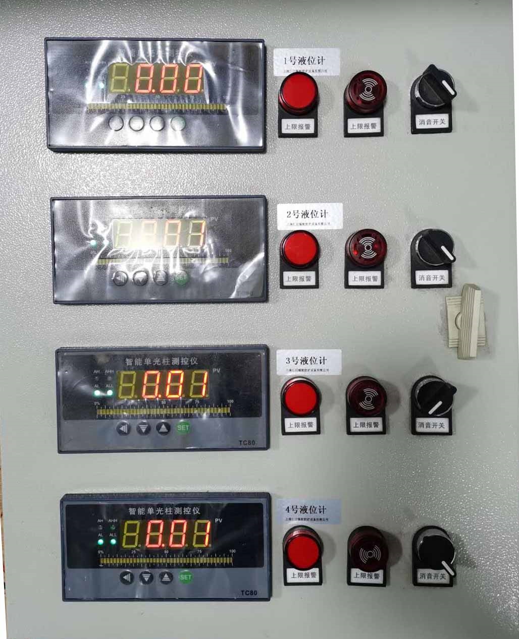控制柜內(nèi)部嵌入有多個液位變聲器控制主機(jī),該主機(jī)能實(shí)時采集液位變送器的數(shù)據(jù),并更加設(shè)定的報(bào)警閾值給出 上下限閾值聲光報(bào)警的功能